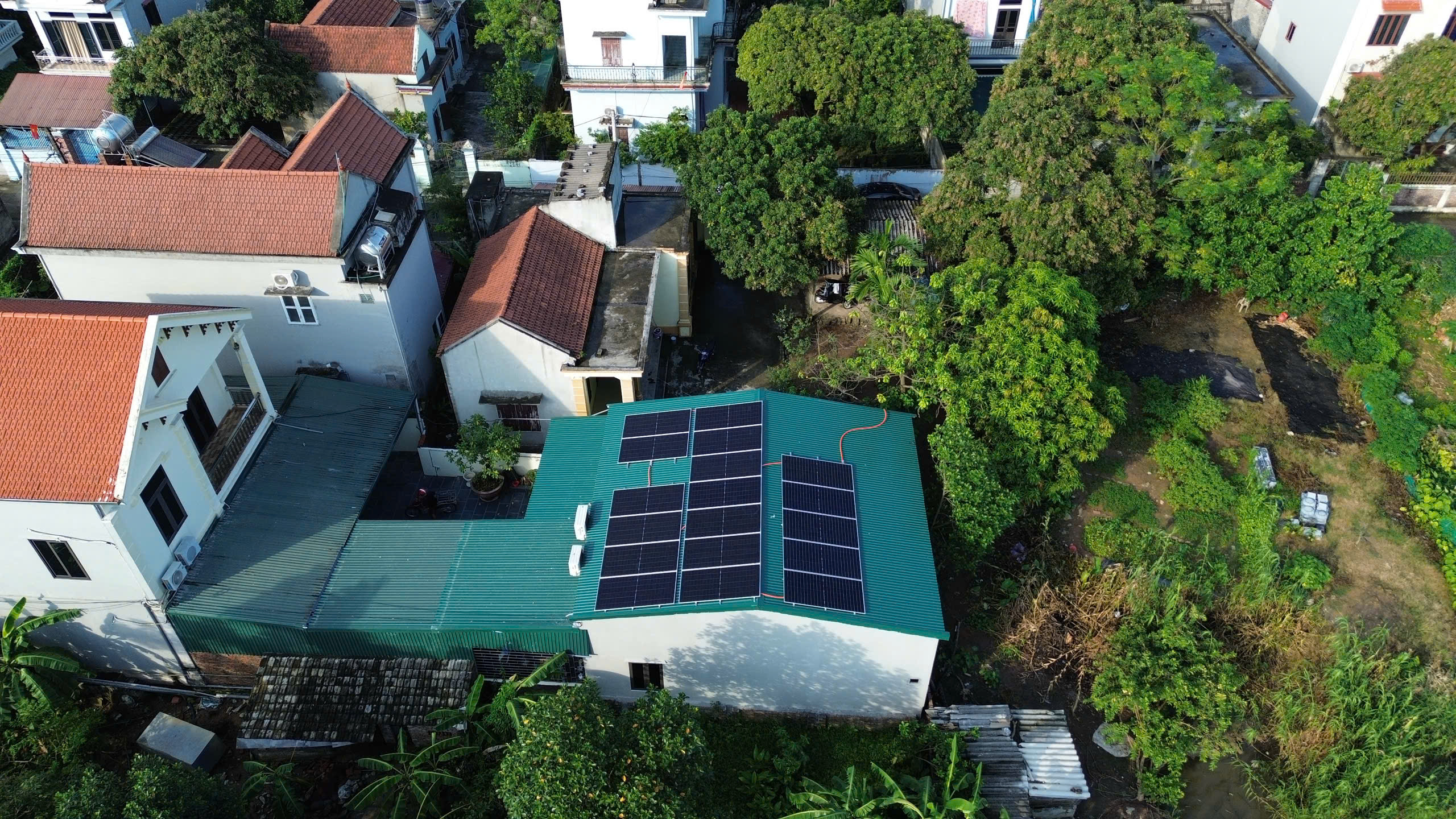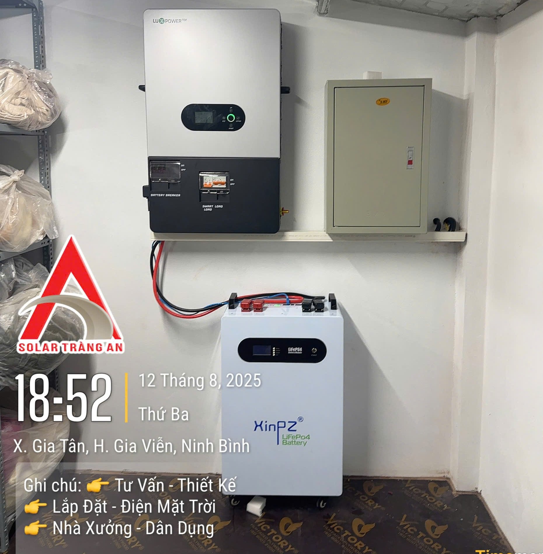 Dự án Hệ thống điện mặt trời 10.5KWP – Gia Vân, Ninh Bình Chi tiết dự án: Công suất: 10.5 kWp Tấm pin mặt trời: 16 tấm Pin Longi 650Wp Inverter: Deye 8KW 1 pha Hybrid Pin lưu trữ: XinPZ 15.6KW Diện tích lắp đặt: 48 m² Sản lượng điện: 945–1500 kW/tháng Hoàn thành: 08.2025