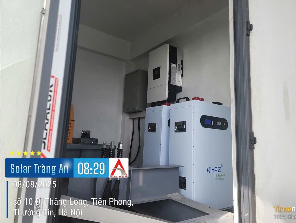 Dự án Hệ thống điện mặt trời 18.4KWP – Trát Cầu, Thường Tín, Hà Nội Chi tiết dự án: Công suất: 18.4 kWp Tấm pin mặt trời: 26 tấm Pin Canadian 710Wp Inverter: Deye 3 pha Hybrid 12KW Pin lưu trữ: 2 Pin lưu trữ XinPZ 400A – 20KW Diện tích lắp đặt: 78 m² Sản lượng điện:1650–2700kW/tháng Hoàn thành : 08.2025