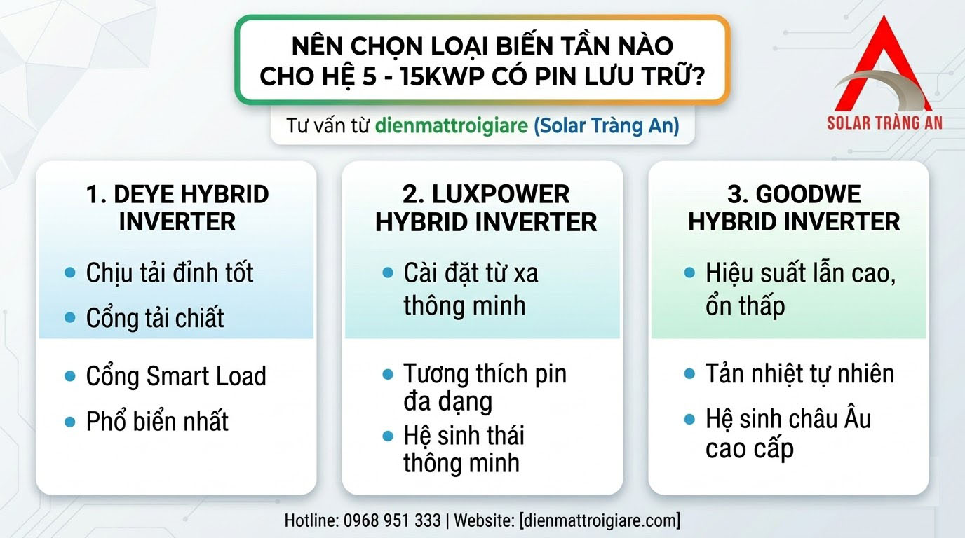 | 12 – 15kWp | Hybrid 12kW hoặc 15kW (3 Pha) | 15kWh – 30kWh |